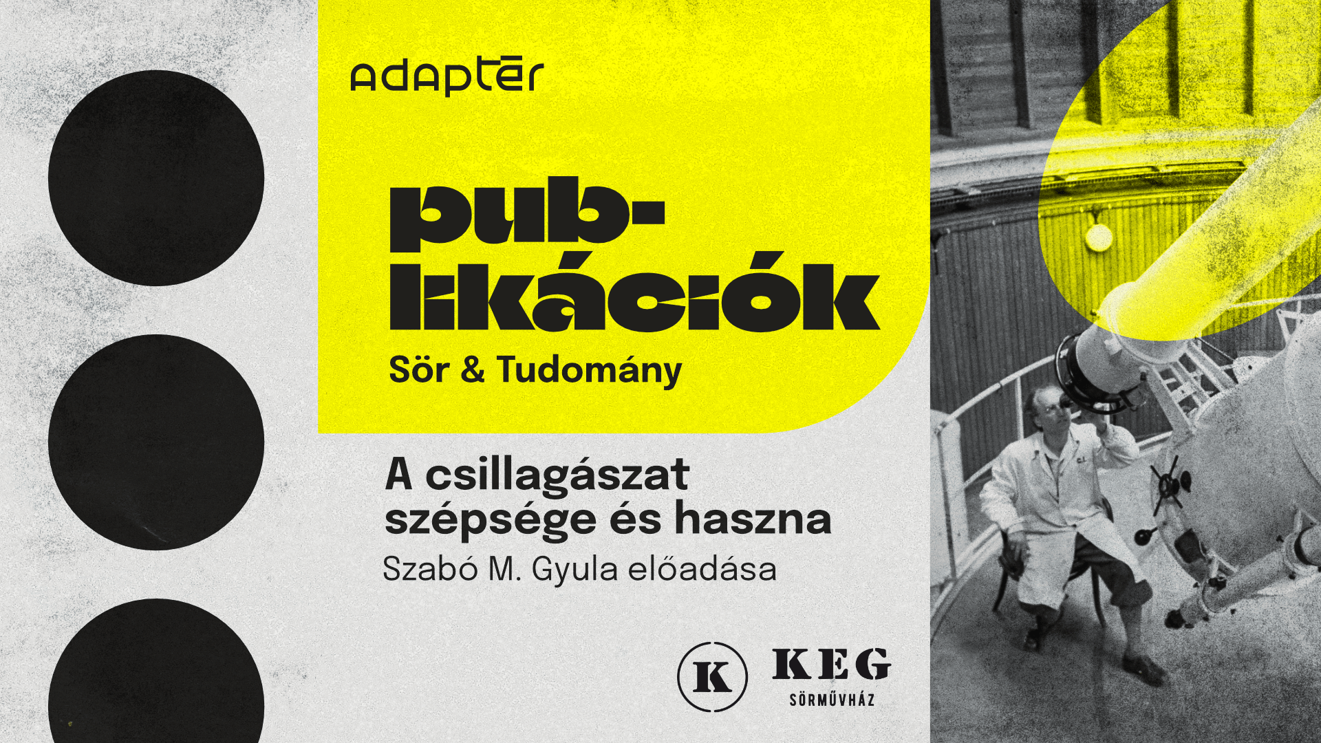 Novemberben a PUB-likációk a KEG Sörművházba költözik, hogy megismertesse az emberekkel a csillagászat szépségeit. Az előadó Szabó M. Gyula, az MTA doktora, az ELTE Gothard Asztrofizikai Obszervatórium igazgatója, az MTA-ELTE Exobolygó Kutatócsoport vezetője.
